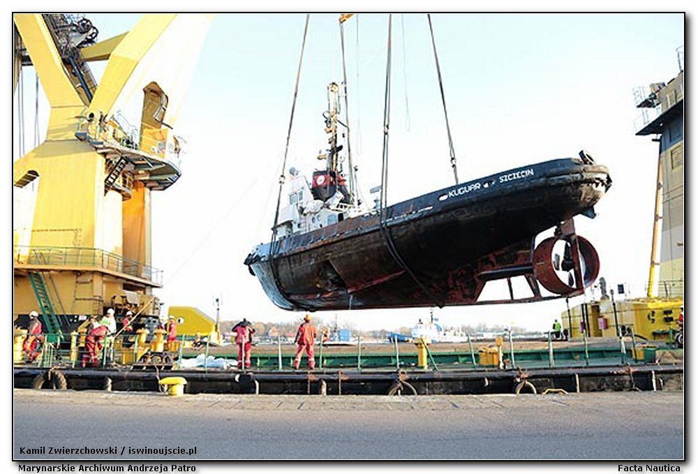 --------19 lutego 2015 r., trzy dni po wypadku zatonięcia KUGUARA, przedstawiliśmy w FACTA NAUTICA sylwetkę tego szczecińskiego holownika. Zaprezentowaliśmy też kilka archiwalnych zdjęć, w tym dwa wraku statku po jego zatonięciu. Opisaliśmy też akcję zabezpieczania wraku przez jednostkę ratowniczą R2. Dzięki uprzejmości Wojciecha Basałygo z portalu swinoujskie.info zamieszczamy poniżej skróconą relację z tego wydarzenia i kilka niepowtarzalnych zdjęć z wydobycia KUGUARA zrobionych przez reporterów tego serwisu. Bezpośrednia akcja po jej uprzednim przygotowaniu rozpoczęła się 8 marca po przybyciu do Świnoujścia dźwigu pływającego MAJA i zakończyła się sukcesem 11 marca. Prawdopodobnie niektóre fotografie, które prezentujemy jeszcze nie były nigdzie publikowane. Powróciliśmy do tematu KUGUARA, ponieważ nie tak dawno inny holownik tego samego armatora - ZEUS - zapalił się podczas postoju w szwedzkim porcie Sölvesborg. Niestety tym razem nie obyło się bez ofiar. -