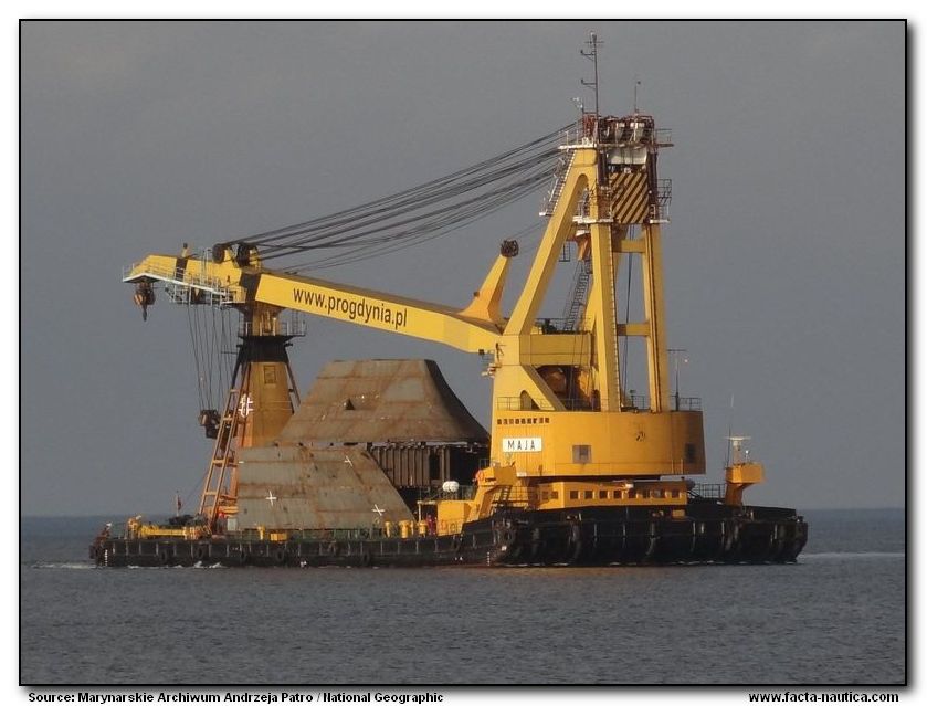 --------"Został on zbudowany w 1980 r., w Sewastopolu i jest wyposażony w 2 silniki główne Sulzera, o mocy 1086 KM każdy oraz w niezbędne urządzenia nawigacyjne, umożliwiające samodzielne poruszanie się po wodach portowych, przybrzeżnych i po Bałtyku. Właściwie są to 2 dźwigi, posadowione na platformie i wyposażone w haki, z których jeden, główny, umożliwia podnoszenie ciężarów o wadze 300 t, a drugi, pomocniczy - o wadze 100 t. Ten pierwszy, może podnieść ładunki z odległości 13,5 m i na wysokość 46 m ponad poziom wody, natomiast nieco mniejsze 120 t ciężary - z odległości blisko 39 m. Współpracując ze sobą, dzięki ruchomemu ramieniu, mogą obracać ładunki o 360 stopni, w pionie i poziomie. Między nimi znajduje się kwadratowy pokład, o boku 19,5 m, służący do przewożenia nietypowych ładunków."