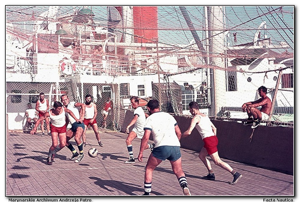 Mecz piłki nożnej na pokładzie jednego ze statków uwięzionych na Wielkim Jeziorze Gorzkim. --